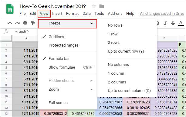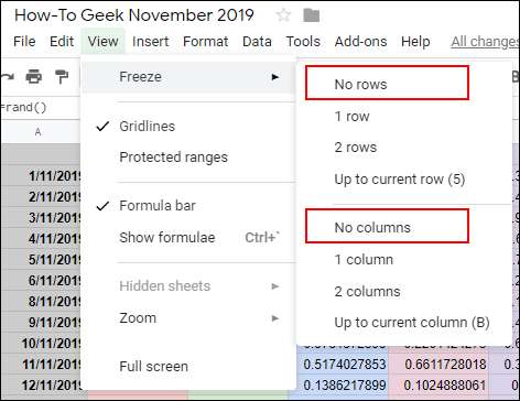 Als u vastgezette kolommen of rijen wilt verwijderen, klikt u op Beeld> Bevroren en selecteert u "Geen rijen" of "Geen kolommen" om deze cellen weer normaal te maken.