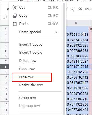 Net als bij het bovenstaande proces: als u een rij in Google Spreadsheets wilt verbergen, klikt u met de rechtermuisknop op de rijkop van de rij die u wilt verbergen.