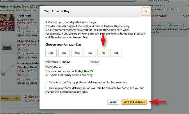 Er verschijnt een pop-up waarin u maximaal twee dagen kunt kiezen die u verkiest voor levering. Amazon zal zijn best doen om uw bestellingen aan u te krijgen op de dag (en) die u kiest. Wanneer u klaar bent, klikt u op of tikt u op "Opslaan en Doorgaan".