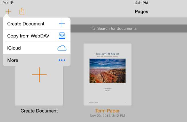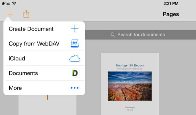 Maar de kernlijm die ervoor zorgt dat dit allemaal werkt, is het uitbreidingssysteem van iOS 8. Zorg er eerst voor dat u een app gebruikt die is bijgewerkt om deze te ondersteunen, zoals Apple's Pages of een andere iWork-app. Een app gebruiken die is bijgewerkt om dit te ondersteunen, bijvoorbeeld Apple's Pages of een andere iWork-app. Open de lijst met opslaglocaties om bestanden van te openen of op te slaan en tik op de optie "Meer ...".