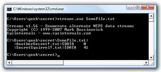 Deze bestanden zijn natuurlijk niet voor iedereen volledig verborgen, omdat je een kleine commandoregel-applicatie kunt gebruiken genaamd Streams.exe om bestanden met streams te detecteren, inclusief de namen van de streams.