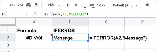 Het tweede argument in een IFERROR-formule is het aangepaste foutmelding dat het eigen bericht van Google Sheets vervangt. Bijvoorbeeld, de bovenstaande illustratie laat zien dat verdelen nul door nul is niet mogelijk. In plaats van het foutbericht van Google (# DIV / 0!) Te geven, wordt een aangepast foutbericht weergegeven.