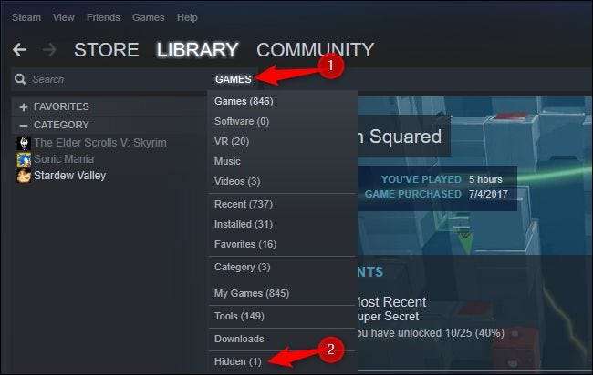 Om je verborgen Steam-games te bekijken, klik je op het categorievak aan de rechterkant van het zoekvak in je gamebibliotheek en selecteer je 'Verborgen'.