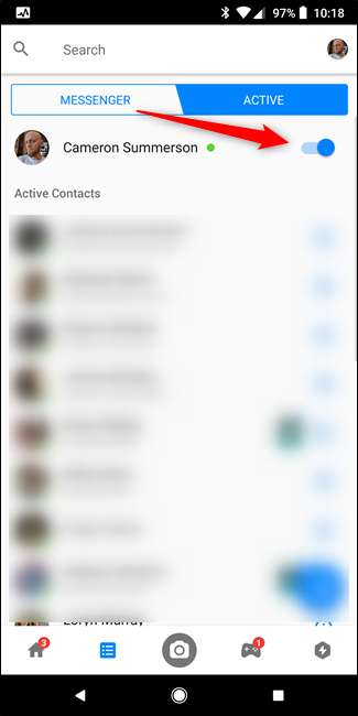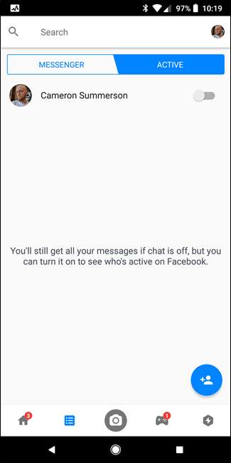 Tik op de schakelaar rechts van uw naam om uw actieve status uit te schakelen. Houd er wel rekening mee dat u hierdoor ook niet meer de actieve status van andere mensen kunt zien - ik denk dat Facebook wil dat dit tweerichtingsverkeer is. Als je dat leuk vindt, ben je hier klaar.