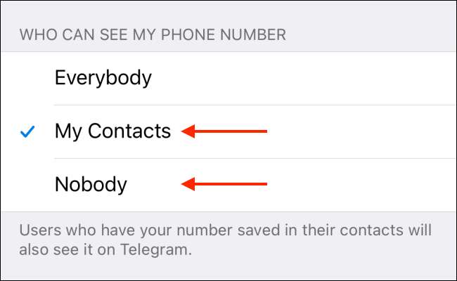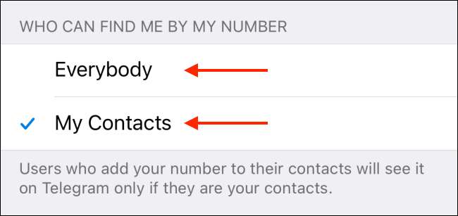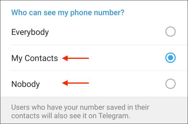 Als je iedereen die je nummer opgeslagen in de lijst met contactpersonen om het op Telegram zien heeft wilt, kunt u overschakelen naar de optie “Iedereen”.