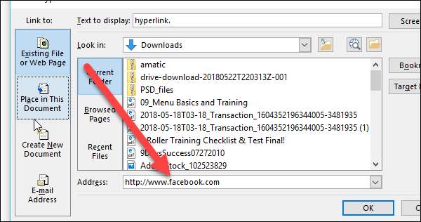 Klik in het venster Hyperlink invoegen op de optie "In dit document plaatsen" aan de linkerkant.