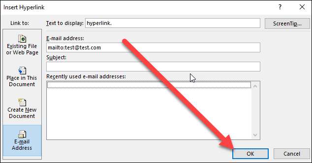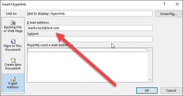 Selecteer de optie "E-mailadres" aan de linkerkant van het venster Hyperlink invoegen.