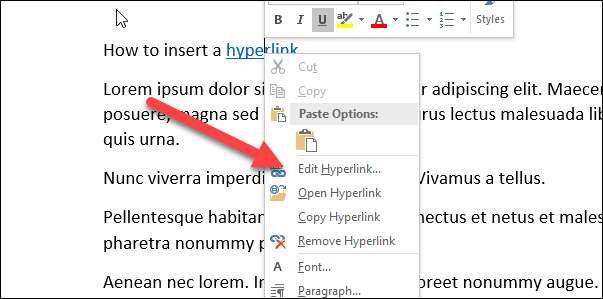 Af en toe moest u een bestaande hyperlink in uw document wijzigen. Om dit te doen, r klik met de rechtermuisknop op de hyperlink en kies vervolgens "Hyperlink bewerken" in het contextmenu.