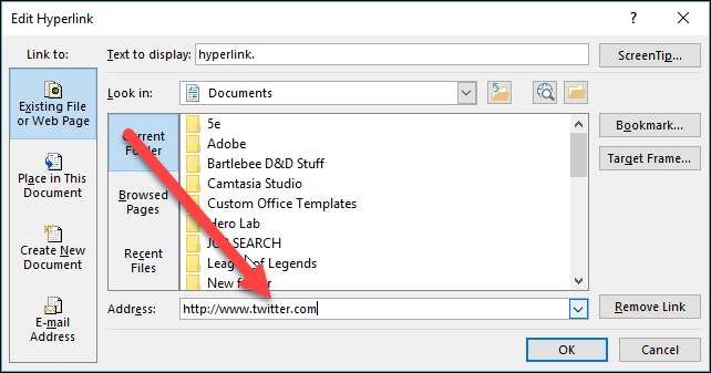 Wijzig of typ een nieuwe hyperlink in het vak "Adres".