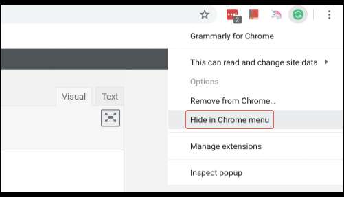 Naarmate u meer extensies installeert, kan dit gebied rommelig worden. Gelukkig kunt u met de rechtermuisknop op het pictogram van de extensie klikken en 'Verbergen in Chrome-menu' selecteren om het naar het menu en de Chrome-werkbalk te verplaatsen.
