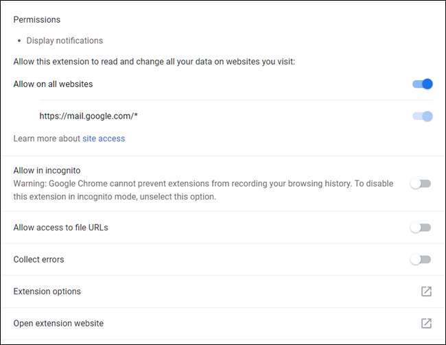 In het instellingenvenster kun je de extensie in- of uitschakelen, hem in de incognitomodus toestaan (de meeste apps zijn daar standaard uitgeschakeld), toegang krijgen tot de opties van een extensie, de website van de extensie openen en toegang tot de site toestaan .