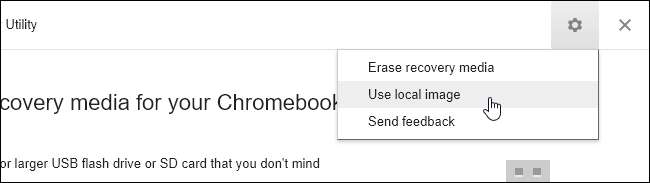 Klik op het tandwielpictogram in de rechterbovenhoek van het Chromebook Recovery Utility-venster en selecteer "Gebruik lokale afbeelding".
