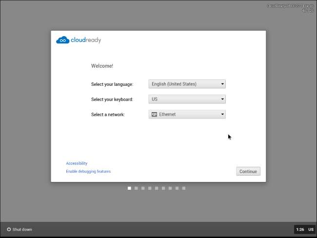Wanneer het opstart, ziet u het gebruikelijke Chrome OS-welkomstscherm met een 'CloudReady'-logo. Selecteer uw taal en netwerk om door te gaan.
