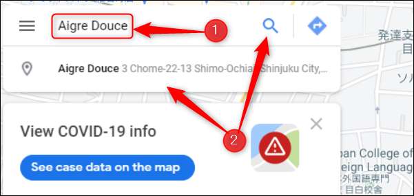 Voer vervolgens de naam of het adres in van de locatie waar u in wilt zoeken in het zoekvak in de linkerbovenhoek van de browser. Klik op het zoekpictogram of het resultaat dat onder het zoekvak verschijnt om de locatie te selecteren. Of u kunt eenvoudig op de locatie op de kaart klikken.