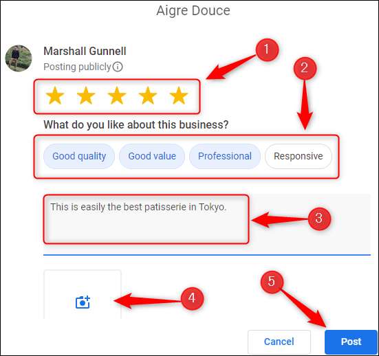 Daarna kunt u een beoordeling typen. Dit kan zo kort zijn of zolang je maar wilt, omdat Google geen woorden instelt voor Google Reviews. Als u enkele foto's van het bedrijf hebt die u wilt delen, kunt u op het vakje klikken met een camerapictogram om ze toe te voegen bij uw lokale computer of van Google-foto's .
