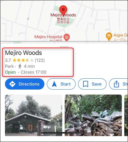 Nadat de locatie is geselecteerd, verschijnt een deelvenster onderaan het scherm dat enkele van de basisinformatie van de locatie toont. Tik op het gebied met de naam van de locatie.