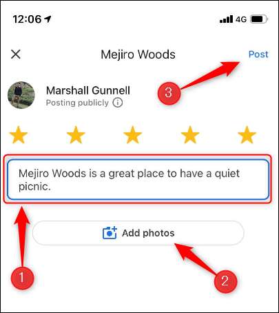 Nadat u de sterrenclassificatie hebt geselecteerd, heeft u de mogelijkheid om een recensie te schrijven. Tik op het tekstvak en typ de inhoud van uw beoordeling in. Als u foto's hebt op uw telefoon die u wilt toevoegen, tikt u op de knop "Foto's toevoegen" om het fotoalbum op uw telefoon te openen en de foto's te selecteren.