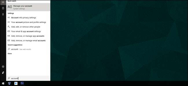 Als uw Windows-machine al is ingesteld, kunt u een nieuw account toevoegen met een nieuw e-mailadres om te gebruiken in plaats van uw Microsoft-account. Klik op de Start-knop, typ 'account' en klik op het zoekresultaat voor 'Beheer uw account'.