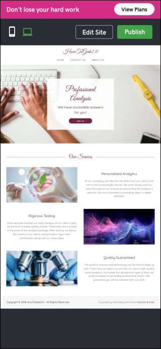 GoDaddy's website builder werkt rechtstreeks vanaf hun website. Ze hebben veel thema's beschikbaar - waarvan u elk onderdeel vrij kunt bewerken - en hebben voorbeelden voor de mobiele en desktopversies van de site. Verwacht geen volledige aanpassing of een uitzonderlijke mobiele ervaring, maar het is vrij eenvoudig om uw site er met wat aanpassingen uit te laten zien zoals u dat wilt.