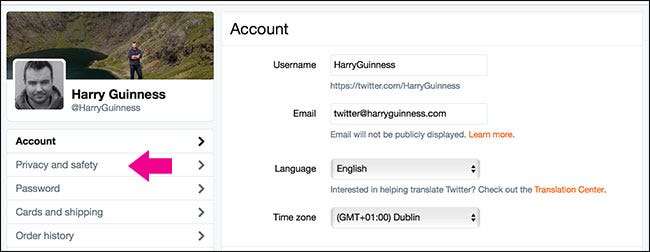 Log in op Twitter en ga vervolgens naar de pagina Instellingen. Je kunt daar komen door op het kleine ronde profielfoto-pictogram in de rechterbovenhoek te klikken en vervolgens op Instellingen en privacy te klikken.