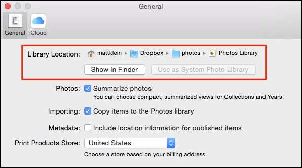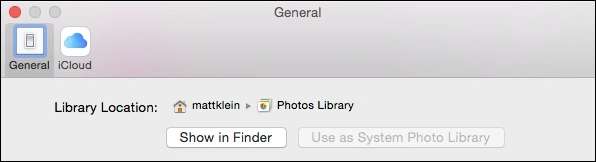 Als u precies wilt weten waar uw bibliotheek zich bevindt, kunt u Foto's openen en vervolgens "Voorkeuren" ("Command +"), en het tabblad "Algemeen" toont u de locatie, die u vervolgens kunt openen in Finder.