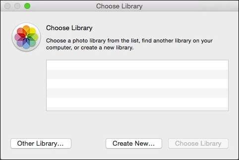 Hier is het dialoogvenster 'Bibliotheek kiezen'. Als u andere fotobibliotheken op uw systeem heeft, worden deze hier vermeld. Als u een bestaande bibliotheek op een andere locatie wilt zoeken (zoals degene waarvan u zojuist een back-up hebt gemaakt), klikt u op 'Andere bibliotheek ...'