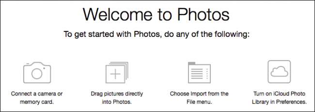 Nu wordt de toepassing Foto's geopend voor een lege bibliotheek met manieren om er foto's aan toe te voegen: u kunt ze importeren vanaf een camera of geheugenkaart, ze importeren vanaf een locatie of afbeeldingen rechtstreeks naar de toepassing slepen.