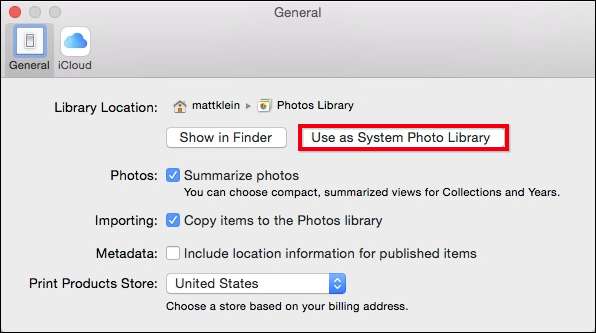 Weet je nog dat er op ons tabblad Algemeen een optie 'Bibliotheeklocatie' is? Klik op "Gebruiken als systeemfotobibliotheek" om de nieuwe bibliotheek te converteren en de iCloud-functies in te schakelen.