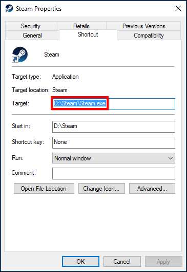 Ga om te beginnen in Windows eerst naar waar uw Steam-bibliotheek zich bevindt. Als je het niet zeker weet, kun je het vinden door te kijken waar de Steam-snelkoppeling naar verwijst door met de rechtermuisknop op de Steam-snelkoppeling te klikken en Eigenschappen te selecteren.