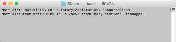 Nu je bent overgeschakeld naar de Steam-bibliotheek in de map Application Support, moet je een symbolische link maken naar de plek waar je de nieuwe SteamApps-map naartoe hebt verplaatst. Gebruik nogmaals Terminal om dit te doen door deze opdracht uit te voeren en te vervangen