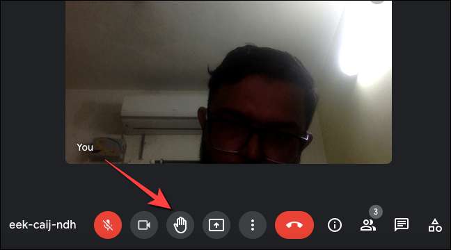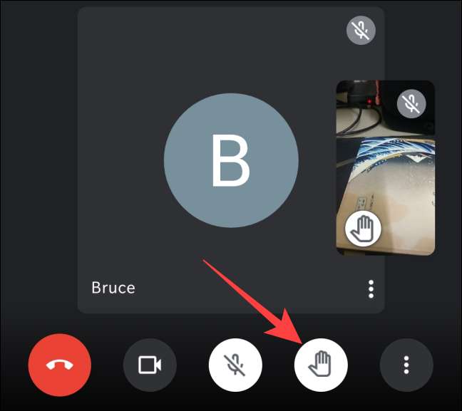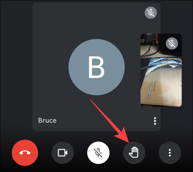 Selecteer in een Google Video-oproep, selecteer de knop "Hand op de knop" HAND "aan de onderkant van het scherm om uw hand op te heffen.
