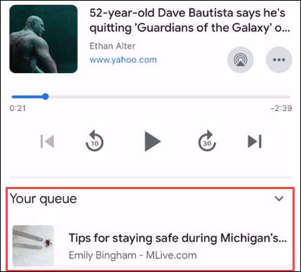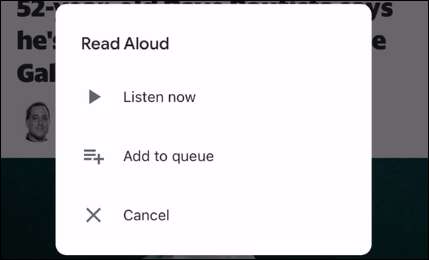 Als u "Toevoegen aan wachtrij" van de pop-up selecteert, wordt het artikel toegevoegd aan een lijst. Vergelijkbaar met een podcast-speler, worden de artikelen hardop in volgorde gelezen.