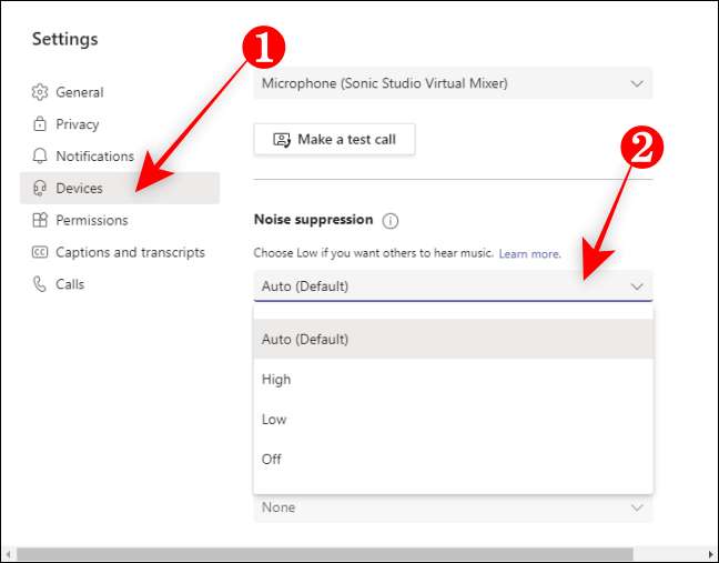 Klik aan de linkerkant op het gedeelte "Apparaten" en zoek vervolgens de vervolgkeuzelijst "Ruisonderdrukking" om de optie uit te kiezen.