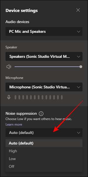 - Auto: Standaard gebruikt, deze optie gebruikt Microsoft-geclaimde AI om de achtergrondruis te schatten en het juiste geluidsonderdrukkingsniveau dienovereenkomstig te kiezen.