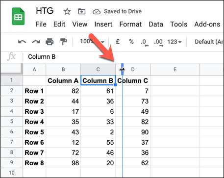 Om dit te doen, opent u uw spreadsheet en beweegt u boven de kolom (te beginnen met A, B, enz.) Of rij (beginnend met 1, 2, enz.) Header-labels. Verplaats uw cursor om over de grens te bewegen totdat de cursor in een pijlpunt verandert.