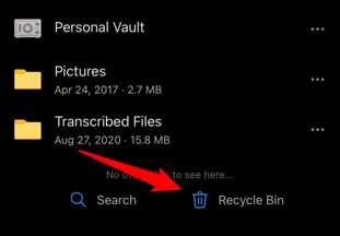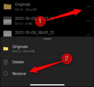 Zoek in de Prullenbak het bestand of de map die u wilt herstellen, tikt u op de drie punten rechts daarvan en selecteer vervolgens "Restore" in het menu dat onderaan het scherm verschijnt.