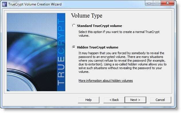 Klik op Volume -> Nieuw volume maken om de wizard Volume maken te starten. Net als in de vorige gids, gaan we selecteren Maak een gecodeerde bestandscontainer . Selecteer in de volgende stap Verborgen TrueCrypt-volume , vervolgens Direct mode .
