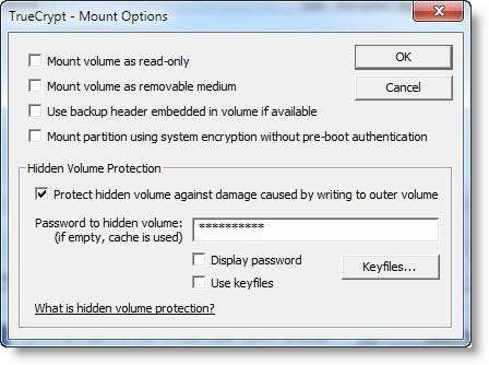 Dus hoe krijg je toegang tot het verborgen volume? Wanneer u het bovenliggende volume koppelt, moet u een wachtwoord invoeren (en mogelijk aanvullende verificaties, zoals een sleutelbestand). Als u het juiste wachtwoord voor het bovenliggende volume invoert, wordt het bovenliggende volume geactiveerd (waardoor de belastingdocumenten worden weergegeven). Om het verborgen volume te activeren, moet u het wachtwoord voor het verborgen volume invoeren in plaats van het wachtwoord voor het bovenliggende volume. TrueCrypt controleert vervolgens een secundaire volumekop met het secundaire wachtwoord en koppelt het verborgen volume aan. Nogmaals, het verborgen volume is volledig niet te onderscheiden van de lege willekeurige ruimte in het bovenliggende volume.