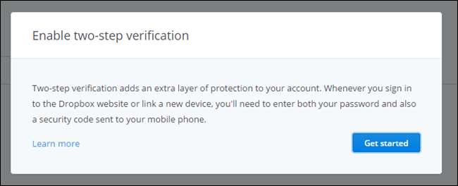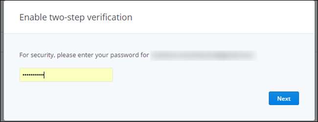 Net onder het gedeelte Wachtwoord ziet u het gedeelte 'Authenticatie in twee stappen'. Klik op "Inschakelen" - er verschijnt een dialoogvenster, klik op "Aan de slag" om ... nou ja, aan de slag te gaan.