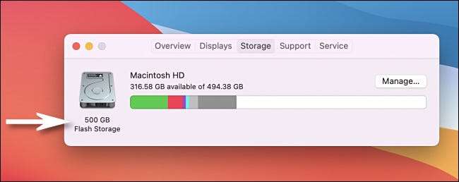 Wanneer de "Opslag" -displays wordt geladen, ziet u een lijst met uw interne drives en de capaciteit van elke station. In ons voorbeeld omvat deze MacBook Pro slechts een enkele schijf met "500 GB Flash-opslag".