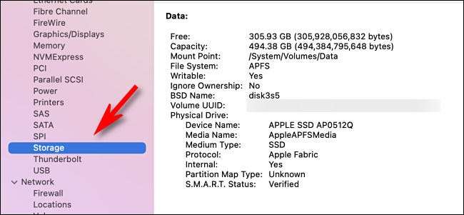 Klik in het venster "Systeeminformatie" op "Opslag" in de zijbalk en ziet u gedetailleerde informatie over al uw schijven. U ziet de grootte van de interne opslag van uw Mac vermeld onder "Capaciteit".