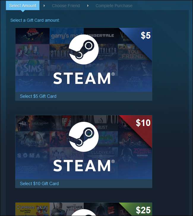 U kunt een cadeaubon kiezen uit de Selecteer de cadeaukaartpagina , ook toegankelijk vanaf de voorpagina van Steam. In de VS zijn de opties voor uw cadeaubon $ 5, $ 10, $ 25, $ 50 of $ 100. Als uw vriend zich in een ander land bevindt of een andere valuta gebruikt dan u, wordt het door u geselecteerde bedrag omgerekend naar de lokale valuta.