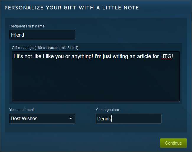U kunt ook een kort bericht aan uw cadeau toevoegen. Zodra je het cadeau hebt verzonden, wordt dit bericht als een e-mail naar je vriend verzonden en verschijnt het ook als een pop-up wanneer ze Steam de volgende keer openen. Klik op verder om door te gaan naar betaling.