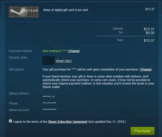 Op de beoordelingspagina kunt u het bedrag van de cadeaubon ($ 13,37 in mijn geval), de ontvanger van het cadeau en de factuurgegevens zien. Als u klaar bent om te verzenden, vinkt u het vakje ToS aan en klikt u op Kopen.
