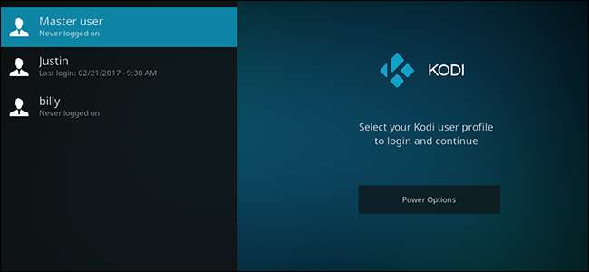 Schakel de optie "Inlogscherm tonen bij opstarten" in en Kodi zal u, wanneer het is geladen, een lijst met profielen geven waaruit u kunt kiezen.