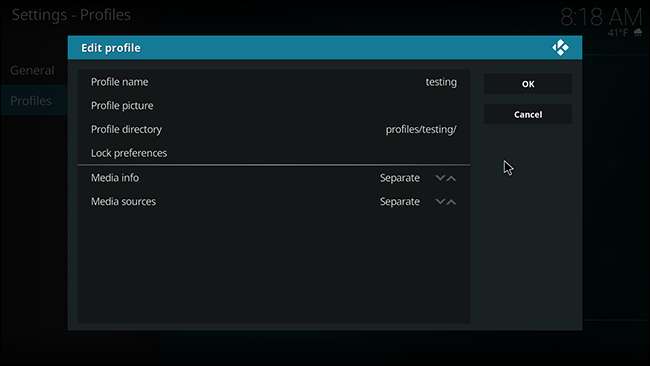 Vervolgens wordt u naar het instellingenscherm van uw nieuwe profiel geleid, waar u de naam kunt wijzigen, een profielfoto kunt toevoegen en de directory kunt wijzigen. U kunt ook kiezen of u media-informatie en mediabronnen wilt delen met het hoofdprofiel, of dat u de zaken volledig gescheiden wilt houden.