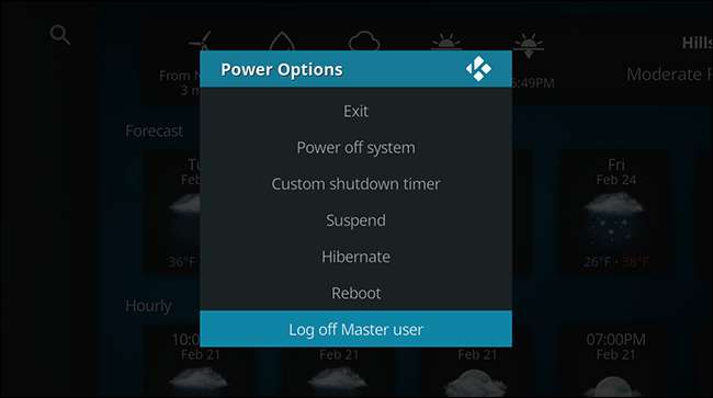 Als je dit scherm liever niet ziet elke keer dat je Kodi start, kun je in plaats daarvan uitloggen bij het hoofdaccount in het Power-menu. Klik in het startscherm op de aan / uit-knop linksboven. U ziet een lijst met opties.