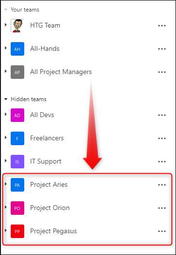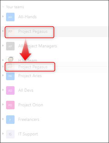 U kunt dit doen door te slepen en teams in verschillende functies in de zijbalk. Klik op het team dat u wilt verplaatsen-in ons geval, het is de “Project Pegasus” team-en sleep deze naar de juiste plaats.