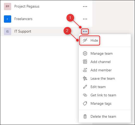 U kunt deze teams verbergen door te klikken op het pictogram met drie stippen naast de teamnaam en het selecteren van “verbergen” in het menu.