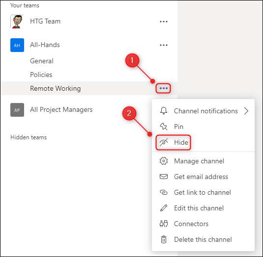 U kunt teams die u zichtbaar wilt houden, maar dat hebben ook een aantal kanalen die u nooit meer naar te kijken. Net als een heel team, kunt u afzonderlijke kanalen verbergen. Klik op het pictogram met drie stippen naast het kanaal en “Verbergen” selecteren in het menu.